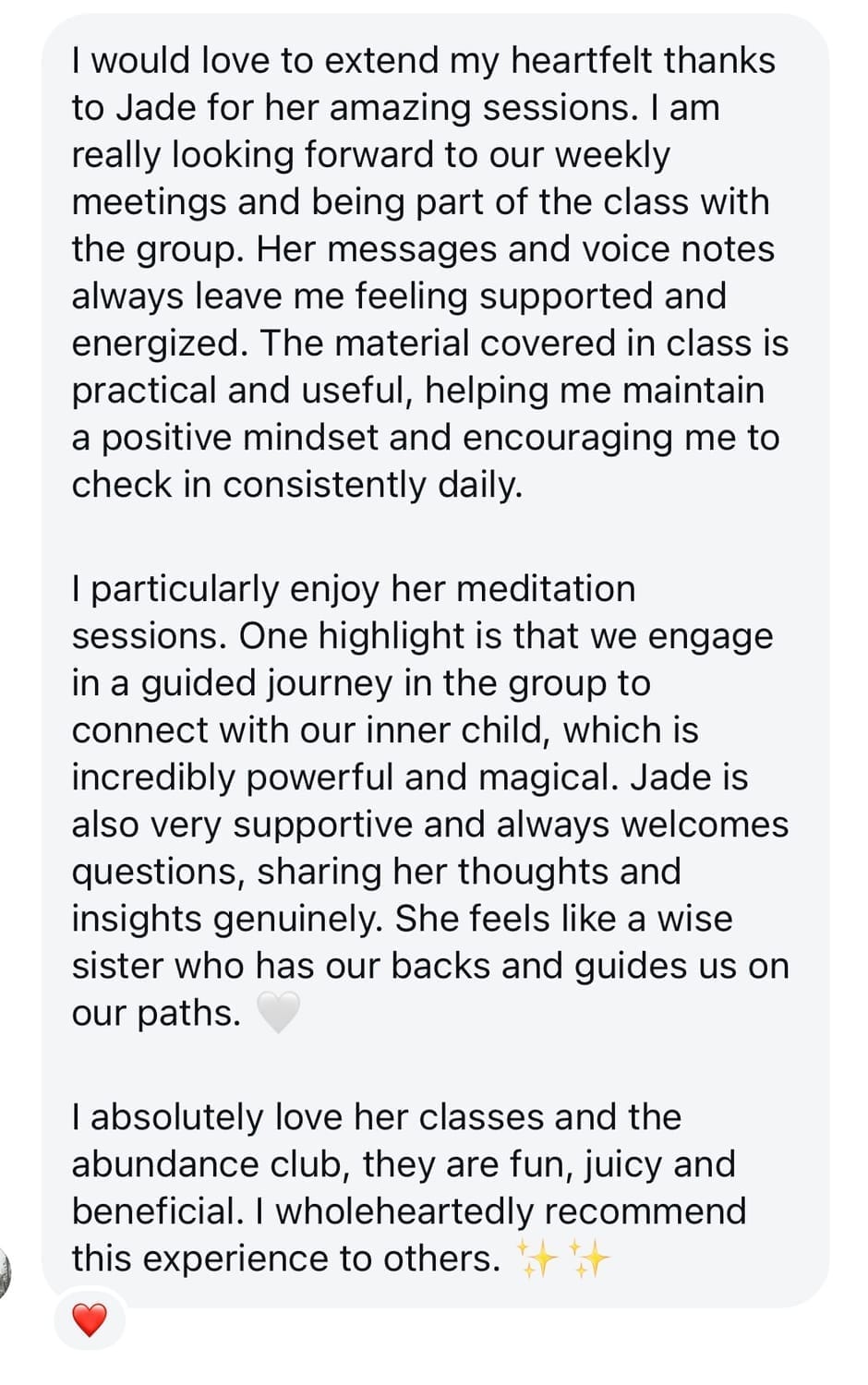 Absolutely! The 6-Week Abundance Club is a powerful group container designed to support both beginners and experienced practitioners alike. Inside this space, you’ll be surrounded by a like-hearted community of women who are committed to growth, expansion, and abundance - just like you. Through weekly live calls, group coaching, and shared reflections, you’ll not only receive tailored guidance, but also witness the breakthroughs of others—which often unlock your own.