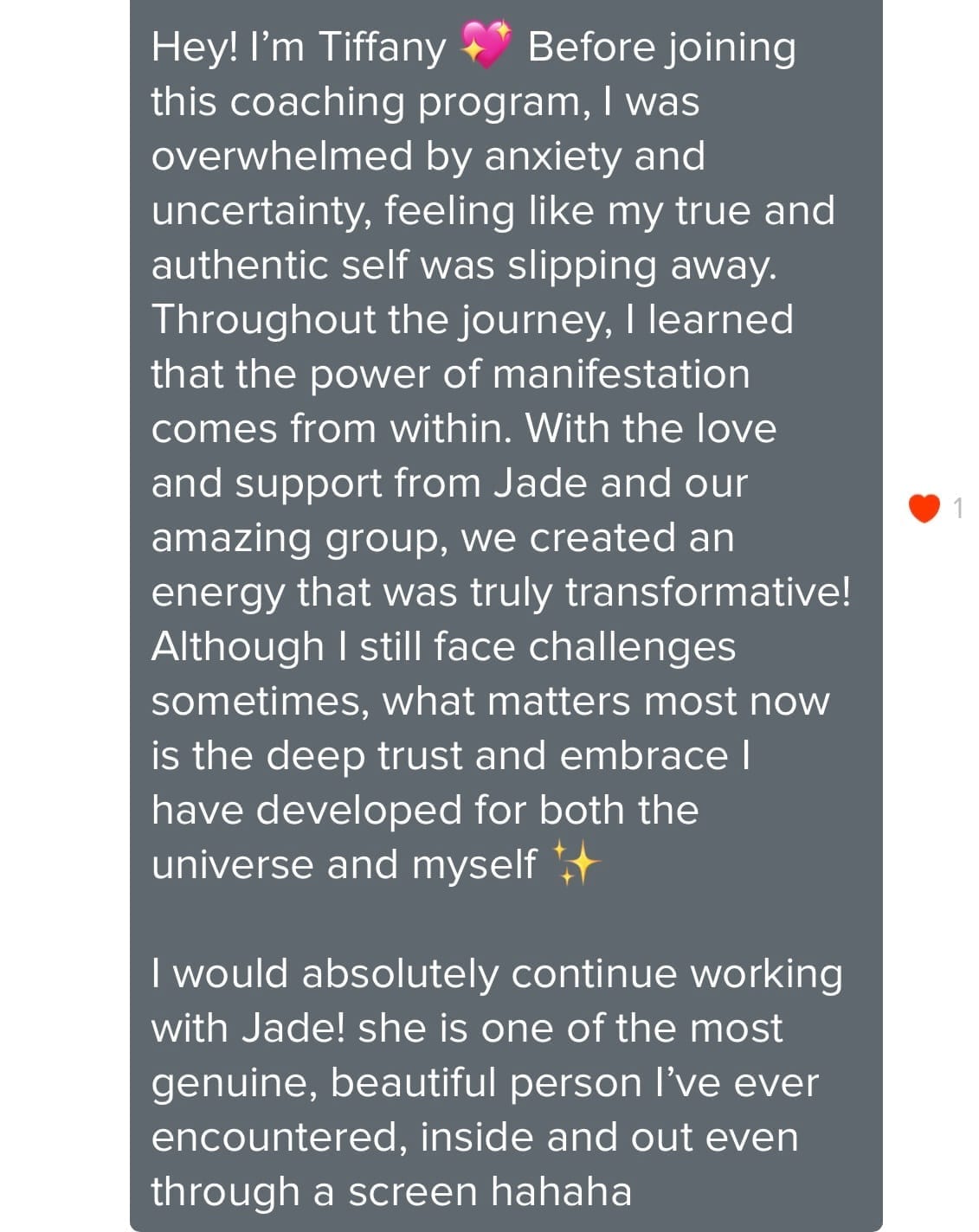 With Jade’s live coaching calls and daily Voxer support, this powerful 6 weeks container is designed to help you shed what no longer serves, rewrite your story, and embody a life of alignment, abundance, and self-trust.