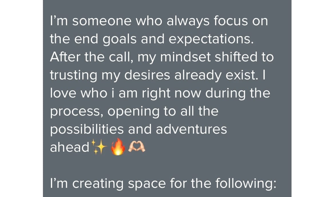 My coaching practice equipped me with range of tools to leverage emotional mastery, neuroplasticity, helping clients overcome resistance, reframe unconscious beliefs, and build powerful deeper transformation from the inside out. Through these three certifications and over 6 years worth of deep self development work, I gained expertise in mindset coaching, quantum principles, and manifestation practices that bridge the gap between science and spirituality. This holistic approach enables me to guide clients in uncovering limiting beliefs, rewiring their subconscious, and creating a life in alignment with their highest potential.